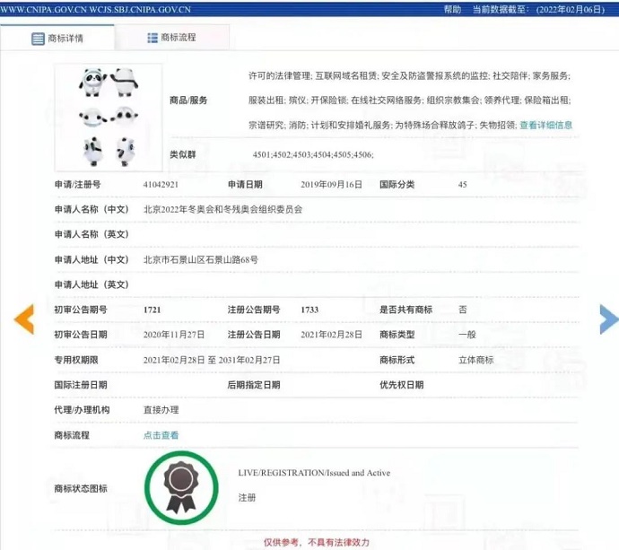 北京冬奧就中英文名稱(chēng)“冰墩墩”“Bing Dwen Dwen”及其三維標(biāo)志在全部45個(gè)類(lèi)別的商標(biāo)于2020年獲準(zhǔn)注冊(cè)。