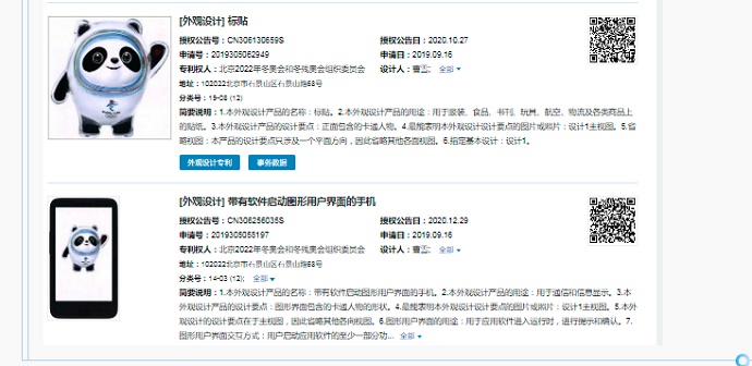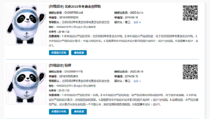 2019年9月,北京冬奧組委向國(guó)家知識(shí)產(chǎn)權(quán)局提交了4件與冰墩墩相關(guān)的外觀設(shè)計(jì)專(zhuān)利,并于2020年獲得授權(quán)。
